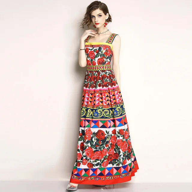 Us 30 0 2018 Musim Panas Boho Merah Chaming Mawar Besar Gaun Wanita Runway Desain Seksi Bunga Cetak Gaun Panjang Pakaian Ukuran Xxl Di Dresses Dari